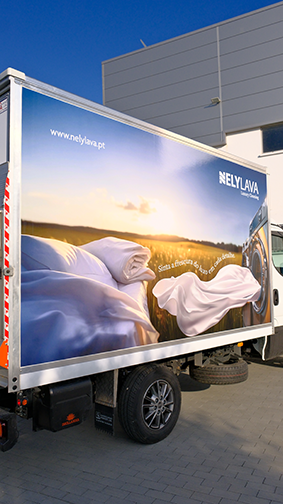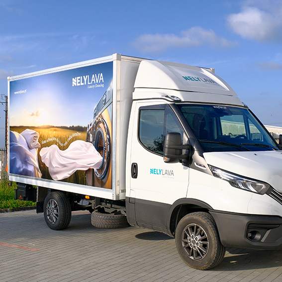 Para a frota de veículos, foi essencial estender o mesmo nível de requinte e clareza. O design escolhido para a decoração da frota visava captar instantaneamente a atenção, mantendo uma ligação estética com a identidade recém-criada. Utilizou-se uma imagem impactante, consistente com a marca, enaltecendo a sensação de limpeza e renovação que a Nelylava promete. A decoração da frota foi desenhada para ser visualmente apelativa e ao mesmo tempo transmitir a excelência e cuidado detalhado dos serviços.